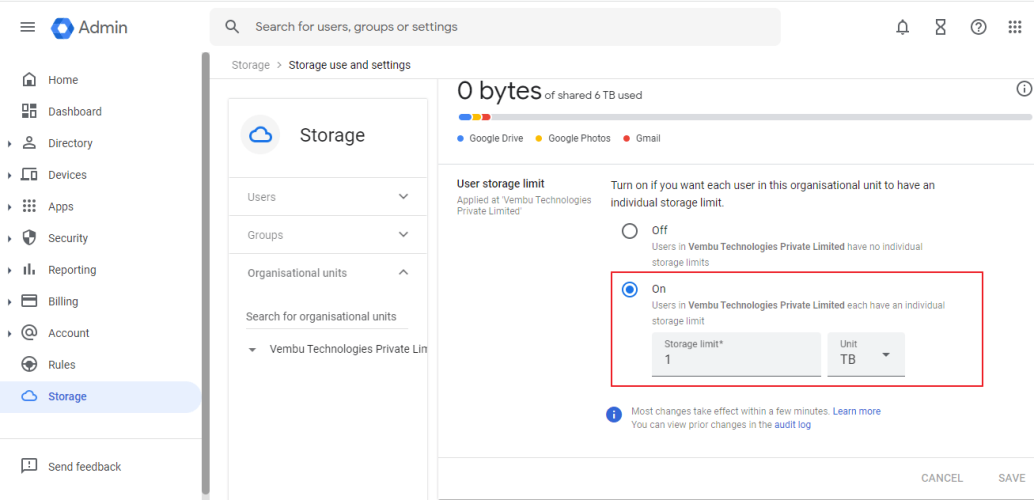 Quản trị viên có thể cài đặt và thay đổi mức dung lượng giới hạn cho mỗi người tuỳ thuộc vào nhu cầu lưu trữ của từng cá nhân, hoặc cài đặt giới hạn dung lượng cho từng phòng ban nhỏ.