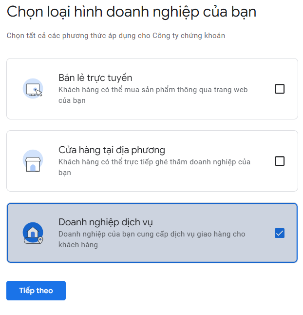 Sau khi đăng nhập thành công, chọn “Bắt đầu” trên trang chủ Google My Business. Tiếp theo, chọn loại hình doanh nghiệp. Ví dụ ở đây chọn: “doanh nghiệp dịch vụ”.