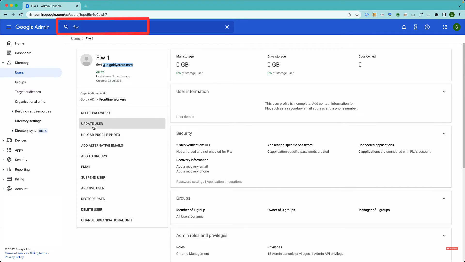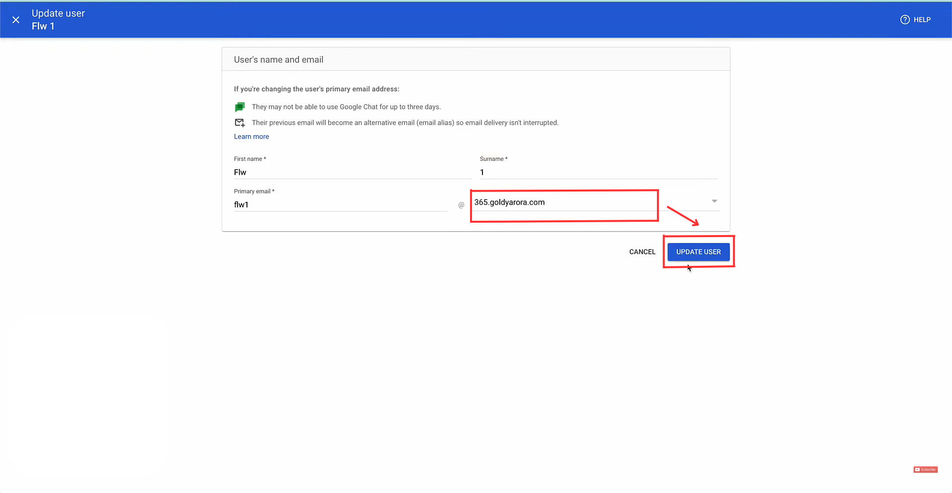 Bước 5: Tại “Primary email” nhập địa chỉ Gmail mới mà doanh nghiệp muốn đổi. Sau đó, chọn “Update user”
