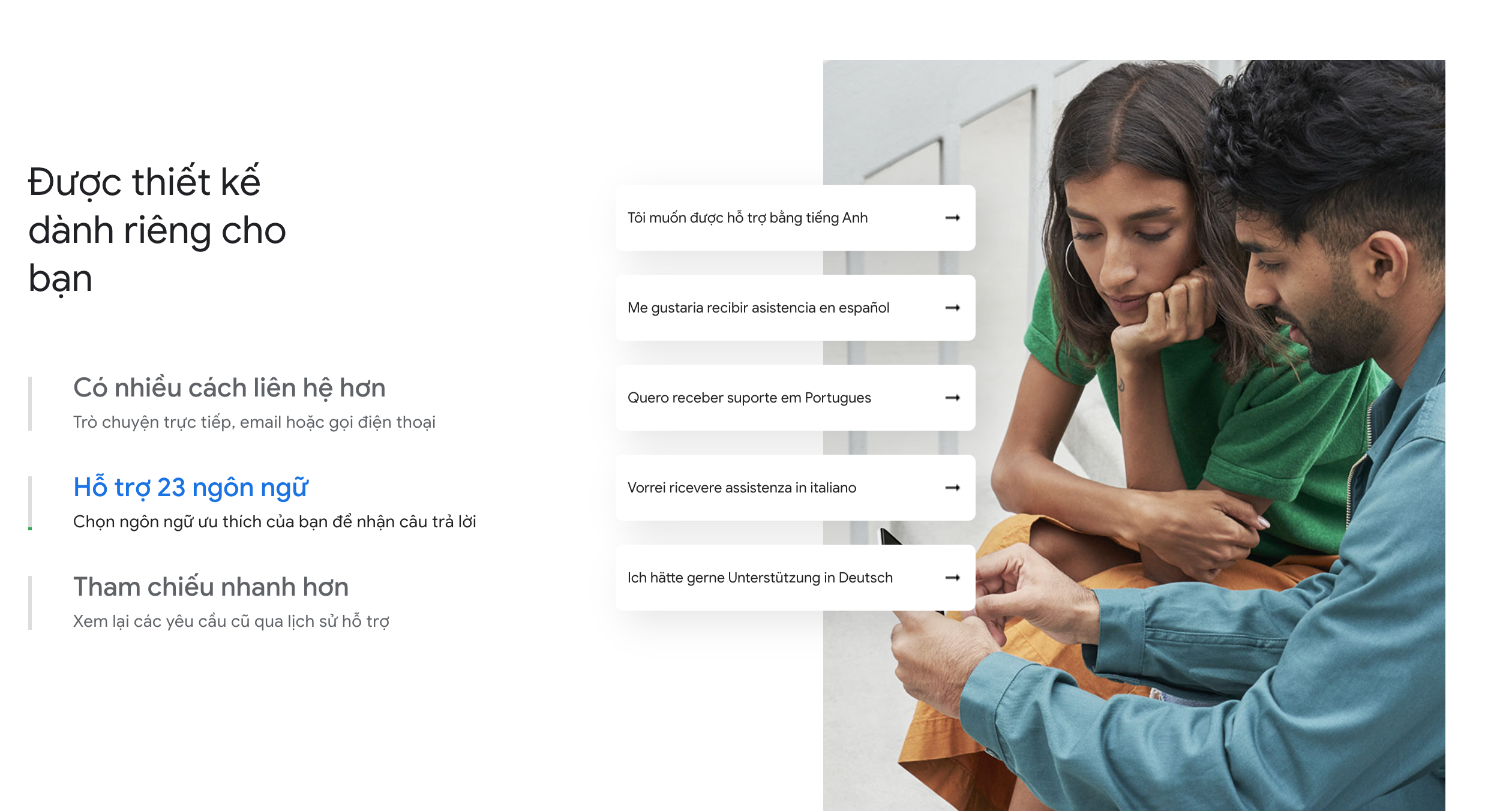 Dịch vụ hỗ trợ của Google có sử dụng tới 23 ngôn ngữ bao gồm cả tiếng Việt.