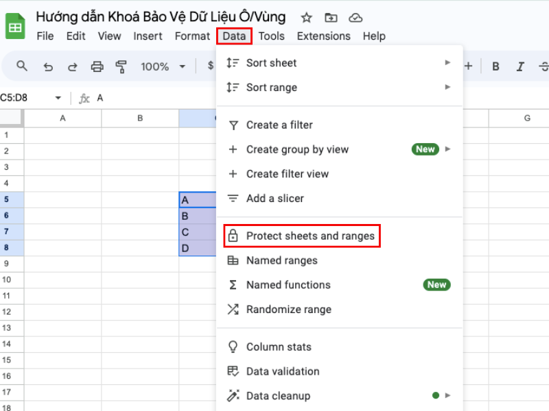 Đây là tính năng cho phép người dùng bảo vệ các ô hoặc phạm vi trong Google trang tính nhằm phòng tránh sự cố thay đổi hoặc xóa dữ liệu không mong muốn. Để sử dụng chức năng khoá bảo vệ dữ liệu, người dùng cần thực hiện: