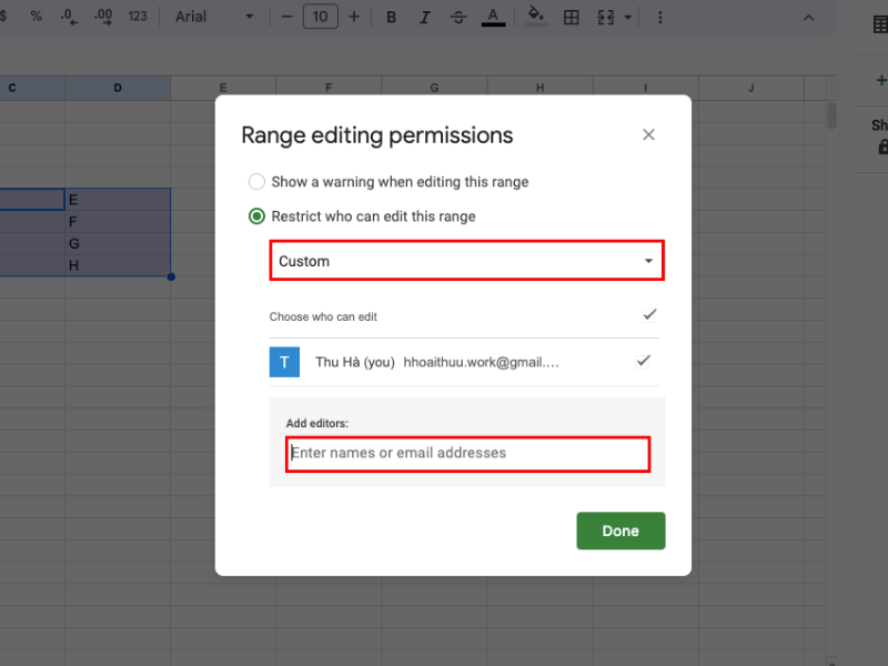 Bước 4: Chọn “Restrict who can edit this range”. Người dùng có thể chọn “Only you” (chỉ mình tôi) hoặc “Custom” (nếu muốn phân quyền chỉnh sửa cho một số thành viên khác)