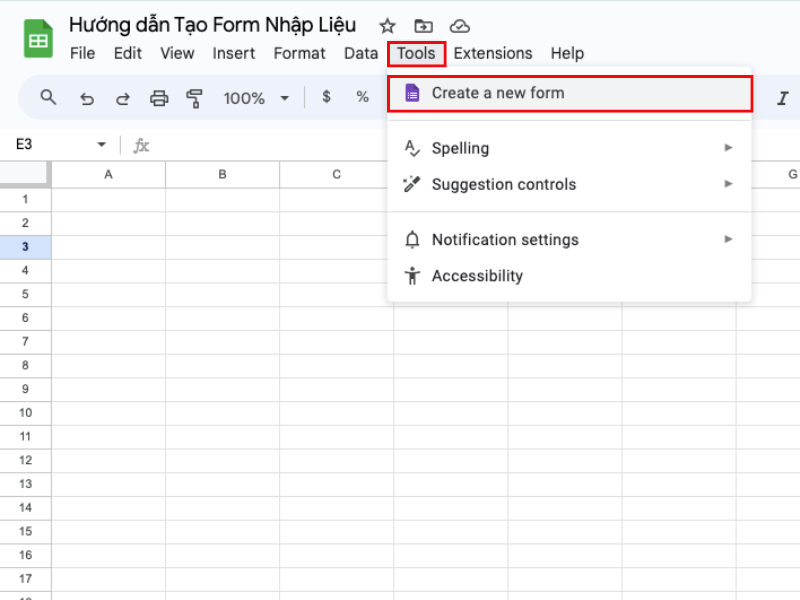 Bước 1. Chọn “Tool” -> Chọn “Create a new form”