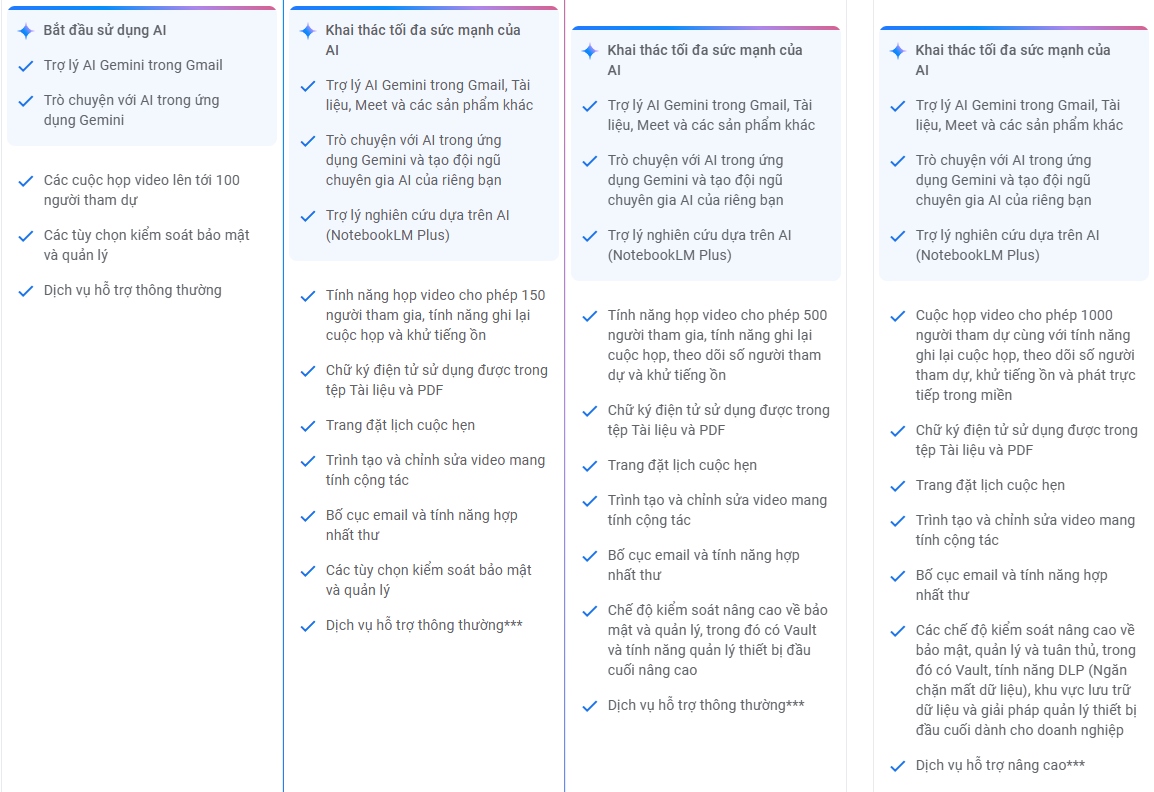 Để tận dụng tối đa các lợi ích từ Google Workspace và công nghệ AI tích hợp, doanh nghiệp nên cân nhắc lựa chọn gói dịch vụ phù hợp với quy mô và nhu cầu cụ thể của mình.