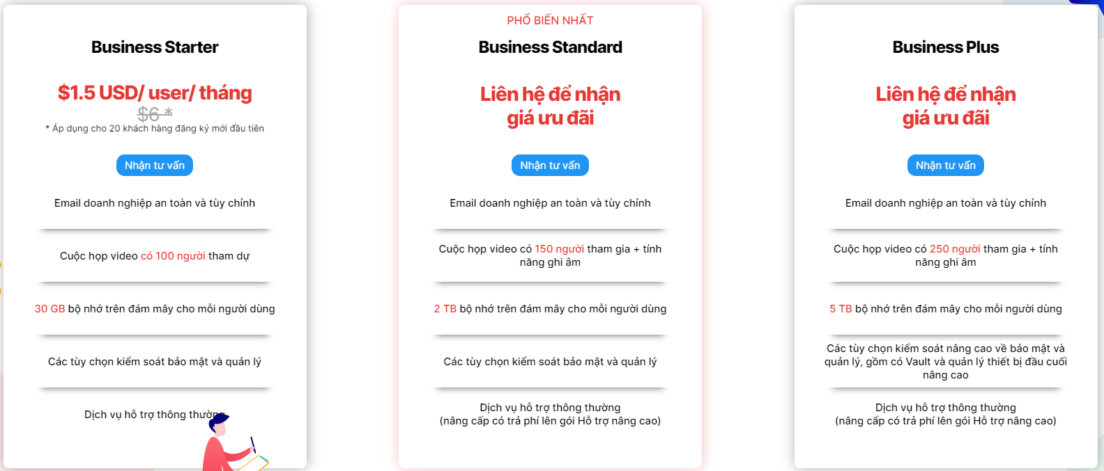 Dói dịch vụ rẻ nhất, Business Starter, có giá $6/ tháng. Tuy nhiên, CleverAds chúng tôi – Đối tác Cao cấp của Google hiện cung cấp trọn bộ sản phẩm Google Workspace với giá chỉ từ $1,5/người dùng/tháng (Đặc biệt giảm giá 80% cho 6 tháng đầu tiên sử dụng sản phẩm).