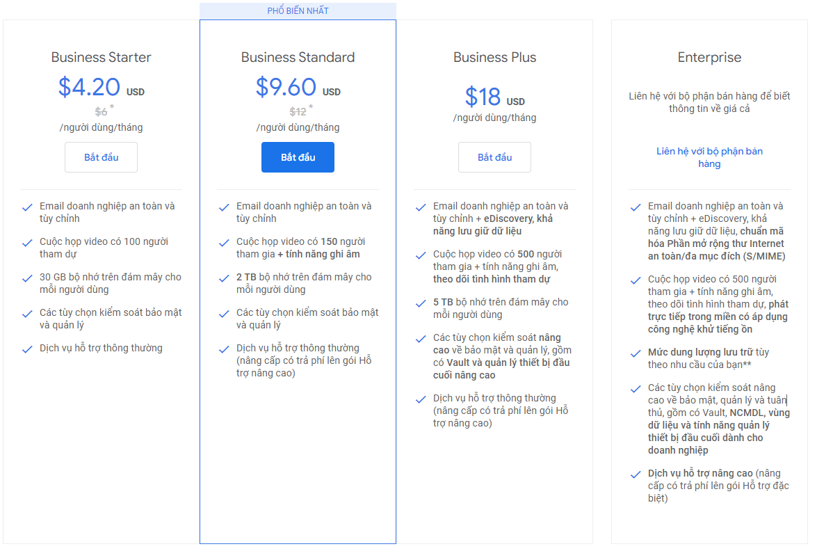Google cung cấp các loại gói dịch vụ cho doanh nghiệp bao gồm: Business Starter, Business Standar, Business Plus và Enterprise.
