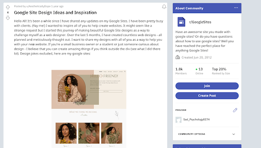 Reddit là một diễn đàn trực tuyến với nhiều cộng đồng chia sẻ thông tin và cảm hứng về nhiều chủ đề khác nhau, bao gồm cả thiết kế web. Duyệt qua các cộng đồng liên quan đến thiết kế để tìm kiếm các bài đăng và nguồn cảm hứng mới cho trang web Google Site của doanh nghiệp.