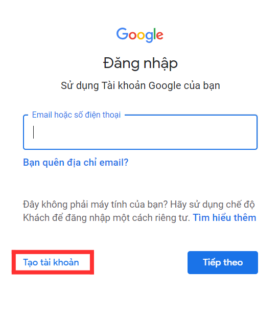 Google hiển thị giao diện đăng nhập. Tuy nhiên, nếu chưa có tài khoản hãy chọn “Tạo tài khoản”.