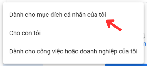 Sau đó, tiếp tục chọn mục đích lập email. Ở đây, Google cung cấp 3 mục đích chính bao gồm “Dành cho mục đích cá nhân của tối” “Cho con tôi” “Dành cho công việc hoặc doanh nghiệp của tôi”.