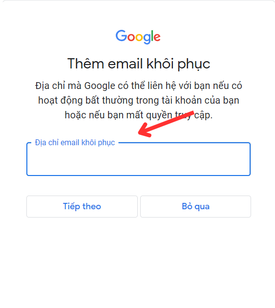 Nhập địa chỉ email khôi phục. Nếu như đây là lần đầu lập email thì có thể sử dụng email của người thân làm địa chỉ email khôi phục cho tài khoản đang lập.